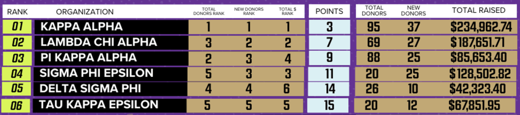 The alumni organization is working on getting us to at least 90 total donors and 48 new donors. To get us “over the top”, we need 6 more alumni brothers to join in the next 11 days.